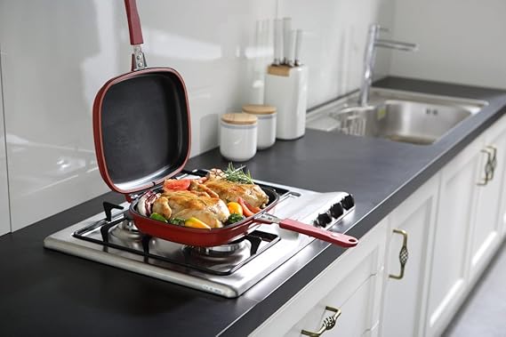 Fabricado con materiales de alta calidad, el sartén doble tapa antiadherente es duradero y resistente al desgaste. Su construcción asegura que pueda soportar un uso intensivo sin perder sus propiedades antiadherentes.