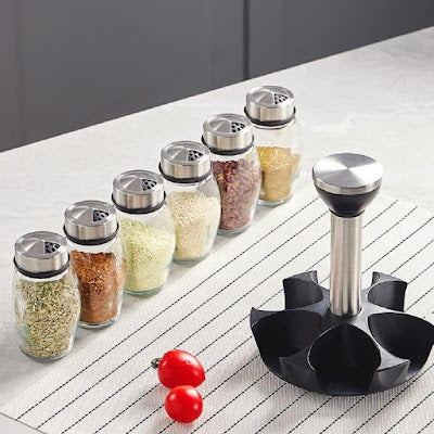 Mantén tus especias organizadas y frescas con este innovador set. Cada frasco está diseñado para ser fácilmente identificable, lo que significa que nunca tendrás que perder tiempo buscando el condimento que necesitas. ¡Dile adiós al desorden y hola a la organización!